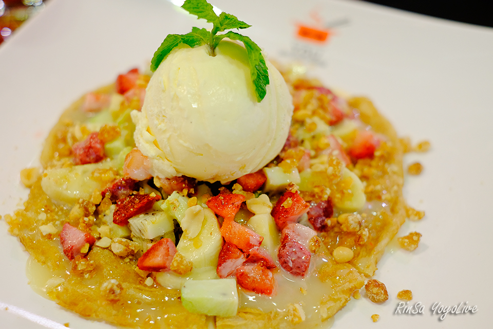 See its appearance, it makes me go in a good mood haha. I like it. The bread is warm, crispy and topping with honey , sweetened condense milk, chocolate, fresh fruits, a little bit sour. Strawberry here is sweet and cool with a whipping cream and Vanilla ice-cream but overall is delicious. I like it.