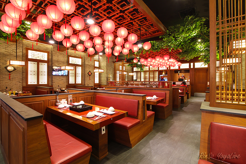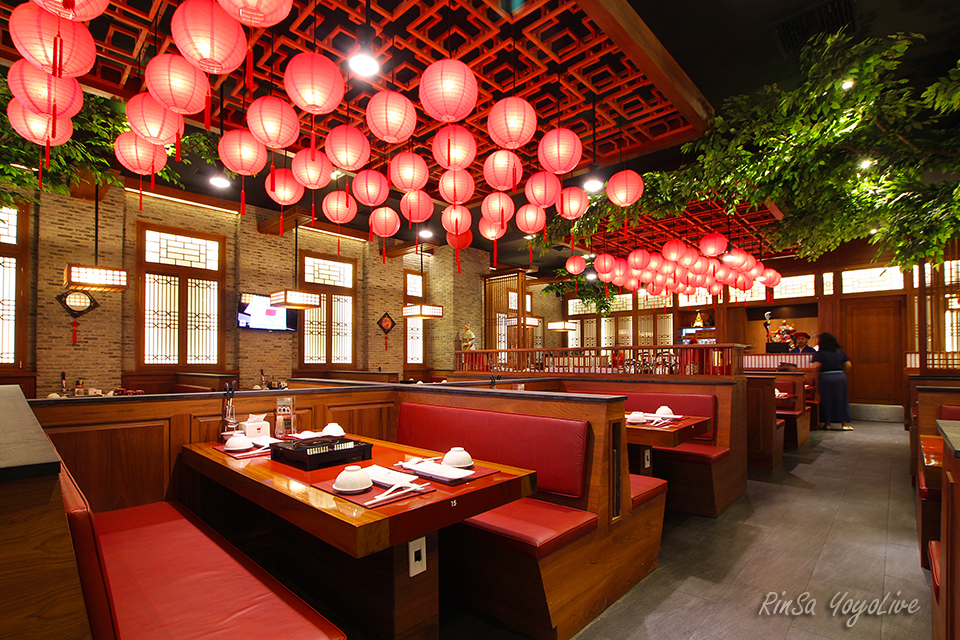 The restaurant is decorated in a Shanghai Chinese style, it gives a Chinese sense with 4 tables line on the left and right.