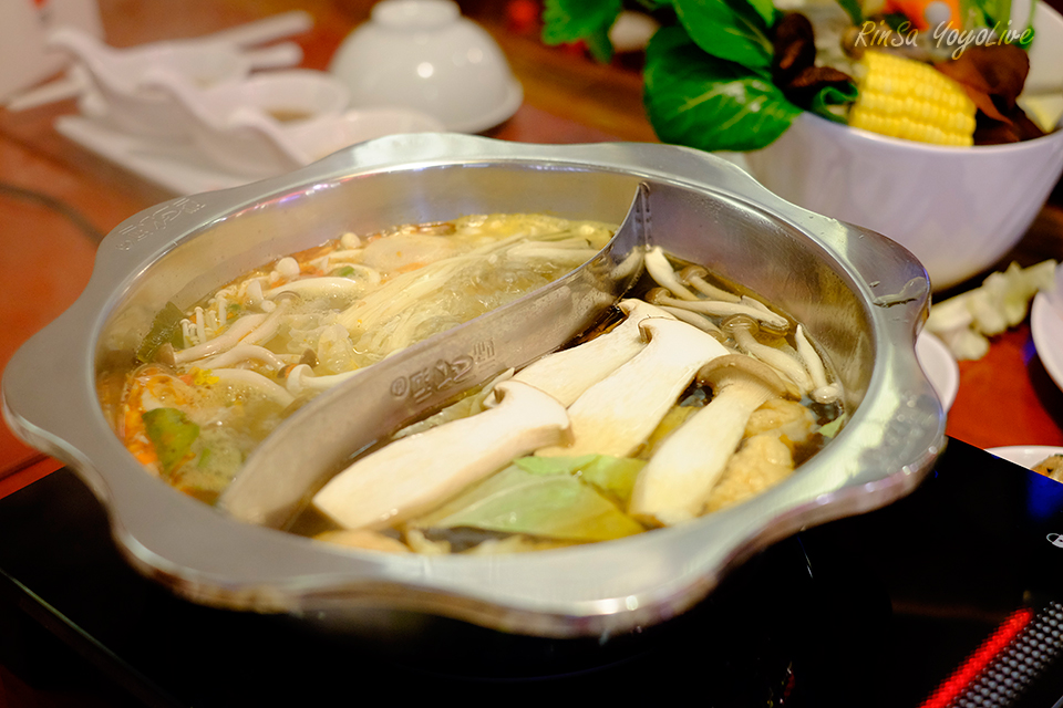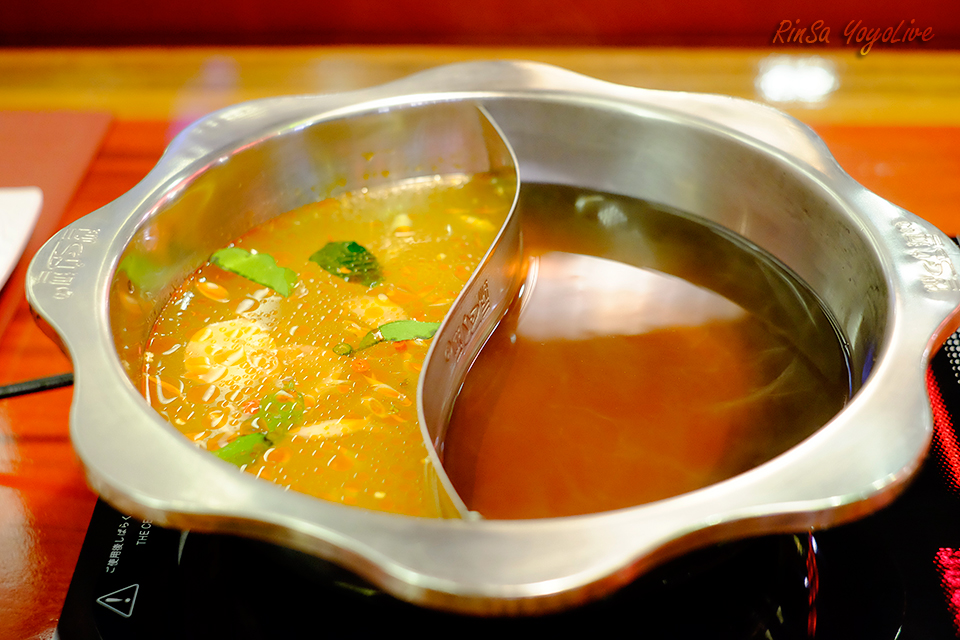 This pot is separated into 2 sides, one is Tom Yum soup and another is Scallop soup. Let turn on the heat now.