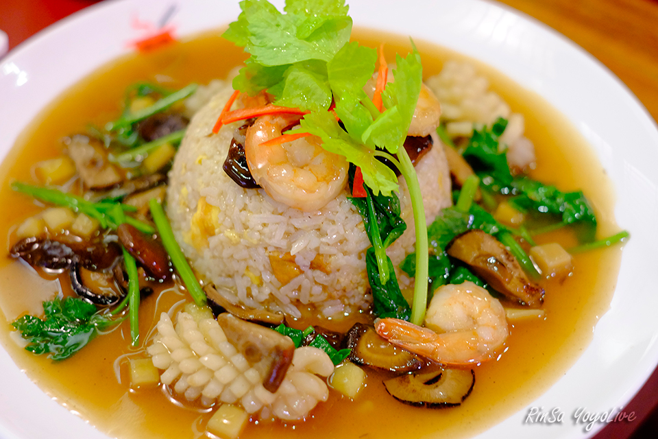 This dish is a Shanghai food style fusion with seafood which includes shrimp, squid, mushroom, a piece of dice ginger.