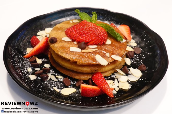Fluffy whole wheat pancakes drizzled with a touch of honey, offering a subtle sweetness. Accompanied by chocolate chips, fresh strawberries, and slivered almonds.