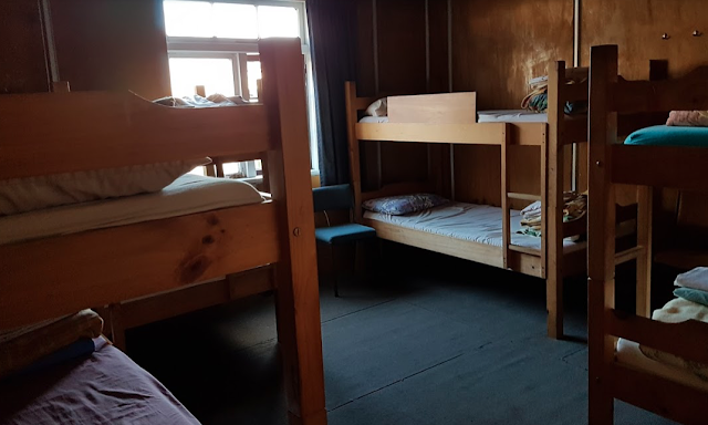 This review provides a brief overview of The Crossing Backpackers, a wooden, single-story hotel resembling a ski resort. The reviewer describes their stay in a cozy four-bed room with a shared bathroom and access to a kitchen. They highlight the beautiful surroundings and affordable price point. A link to the hotel's location on Google Maps and an image are included.