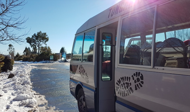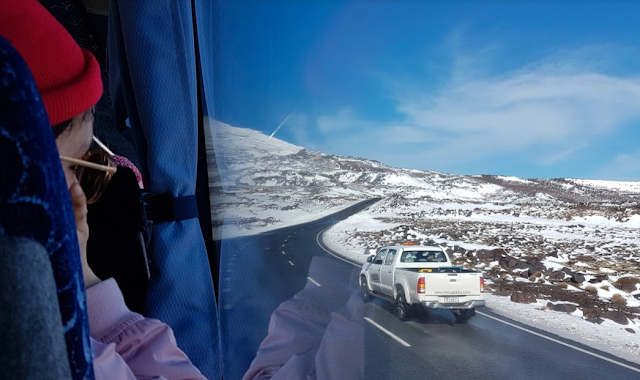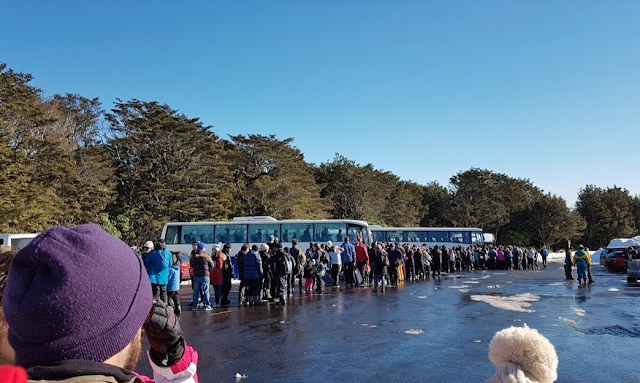 The view on the way to Tongariro National Park is amazing. This car will stop at the foot of the mountain, and we need to change to another car. Today, the queue is very long. In fact, there is a bus that goes directly up the mountain, but we must have taken the wrong one. But this place is already fun, so I said that we will come here to play in the snow tomorrow.