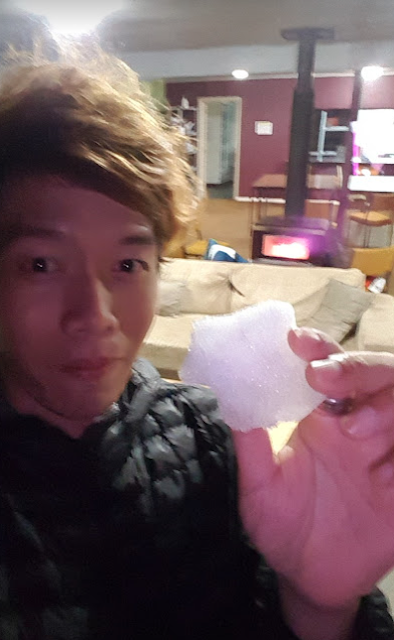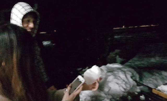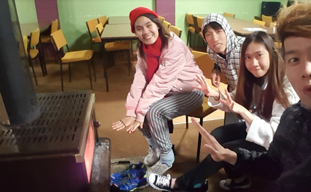 We arrived at our accommodation to find fresh snow all around. It was beautiful, but also very cold. Our group consisted of three Thais and one Japanese person. The Japanese person was probably tired of the snow, haha. For the evening, we warmed ourselves by the fire, played ping pong, chatted, and went out to take photos of the snow.