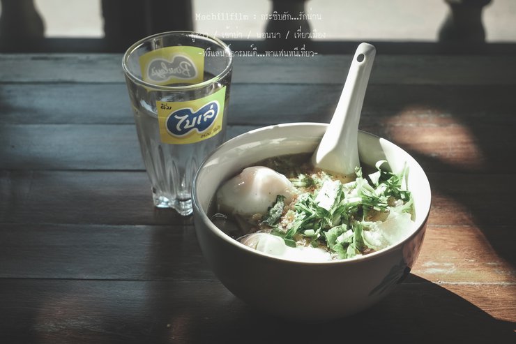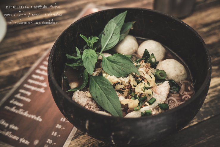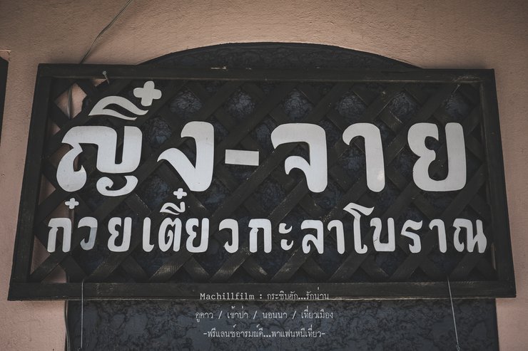Let's drive around, whoosh! There it is! The eye-catching sign of the shop, "Ying-Jai Coconut Shell Noodle, an Ancient Recipe".