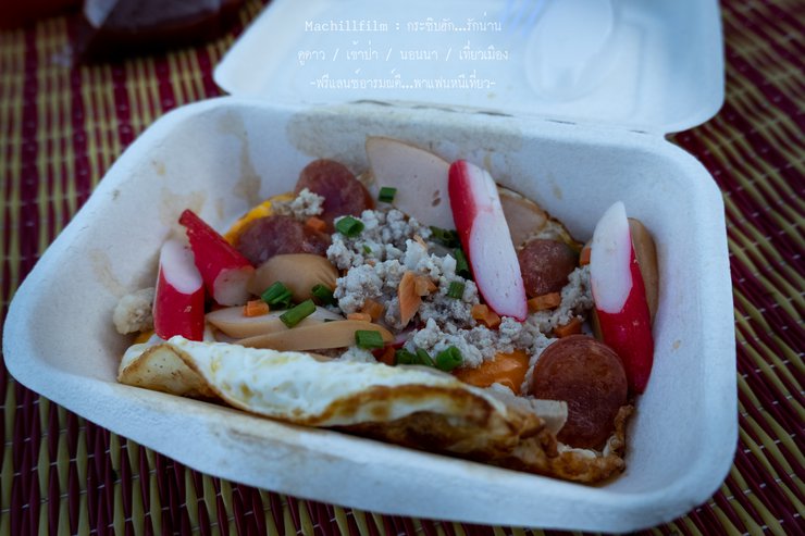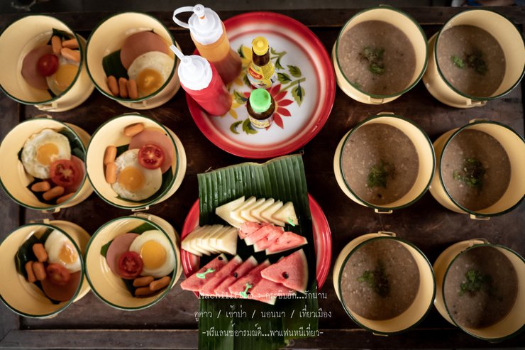 After enjoying the view, it was time to come down and take a shower. While waiting for each person to finish, we ordered food from the restaurant below to be delivered, as usual. We had a little snack because we didn't know what we would encounter next. It's better to eat first for peace of mind and a full stomach. And of course, the most popular menu item was the fried egg. One thing I noticed is that this place uses almost 100% sugarcane bagasse boxes, which are biodegradable and environmentally friendly. This is a great thing. Let's give a round of applause to everyone involved. They have a strong sense of love for their hometown.