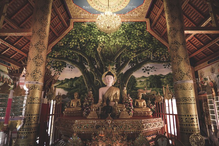 Inside the ordination hall, the principal Buddha image is enshrined in the center. The white statue is adorned in a golden robe. The origin and history of the statue remain unclear.
