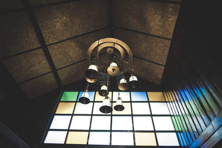 The multicolored stained glass evokes a sense of awe and reverence reminiscent of a Christian church.