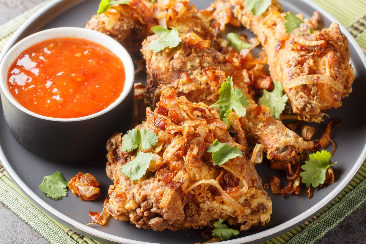 Other must-try snacks include Kanom Krok, crispy coconut pancakes with a creamy center, and Thai-style Fried Chicken — crispy, juicy, and seasoned with fragrant herbs.