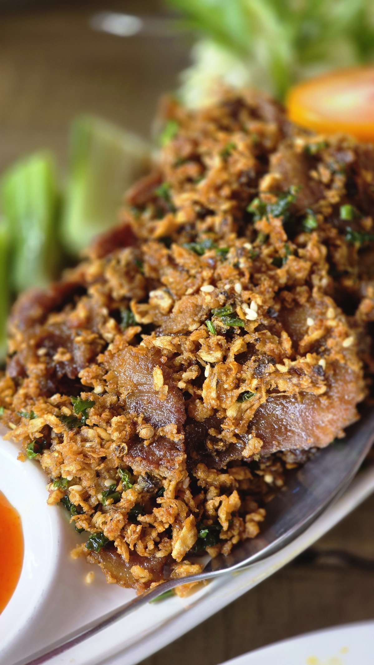Deep fried beef with garlic and sesame