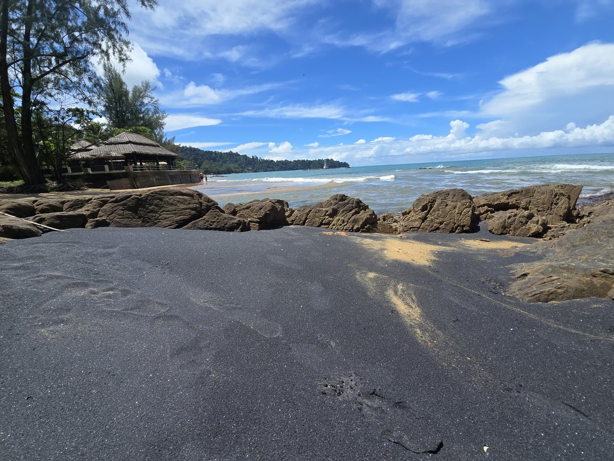 And we went there. There is a glister black sandy beach