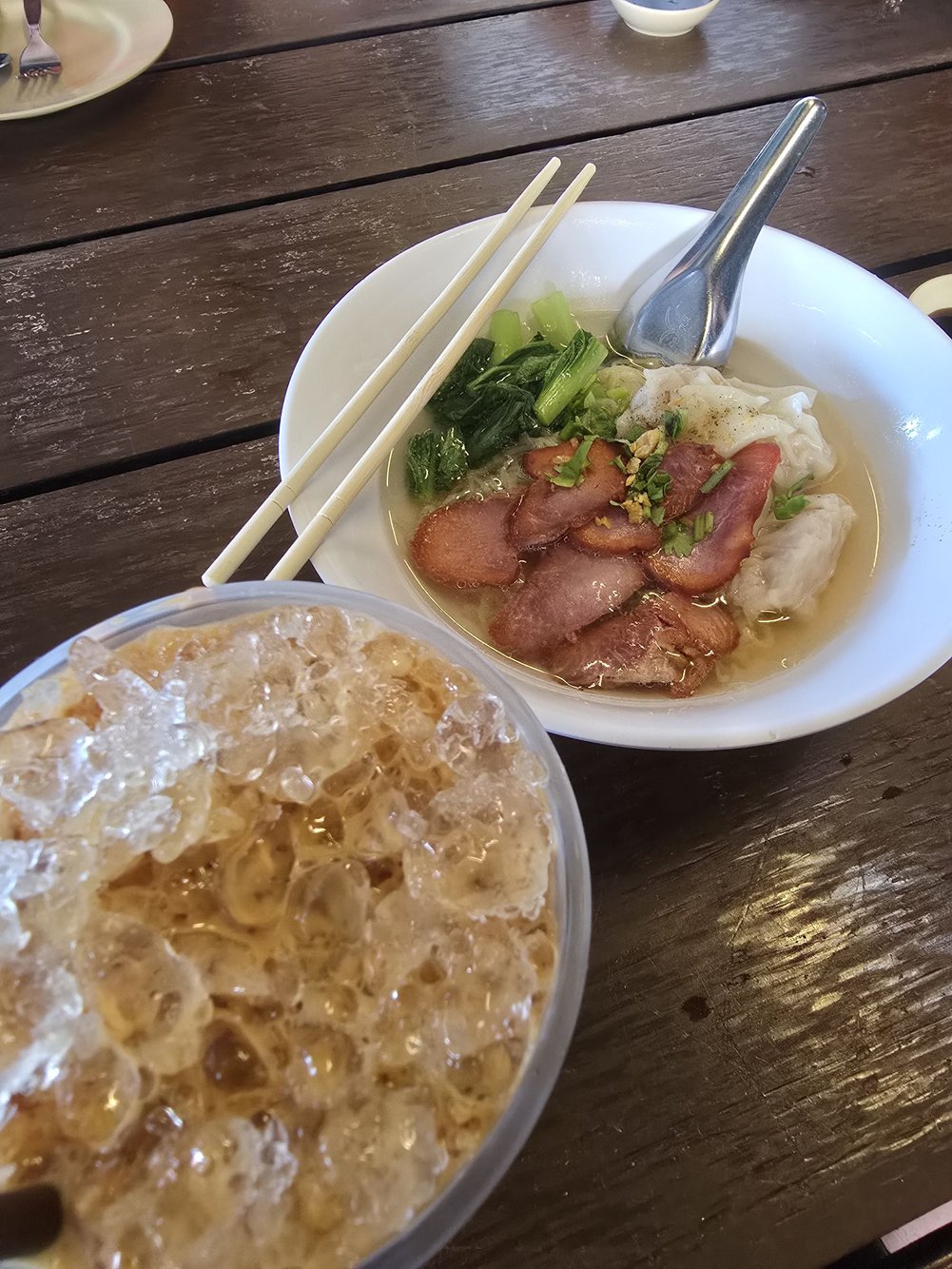 I order egg noodle with red pork and soup