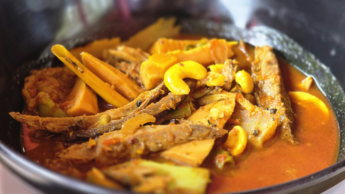 Spicy soup, young coconut leaf with fish in yellow curry