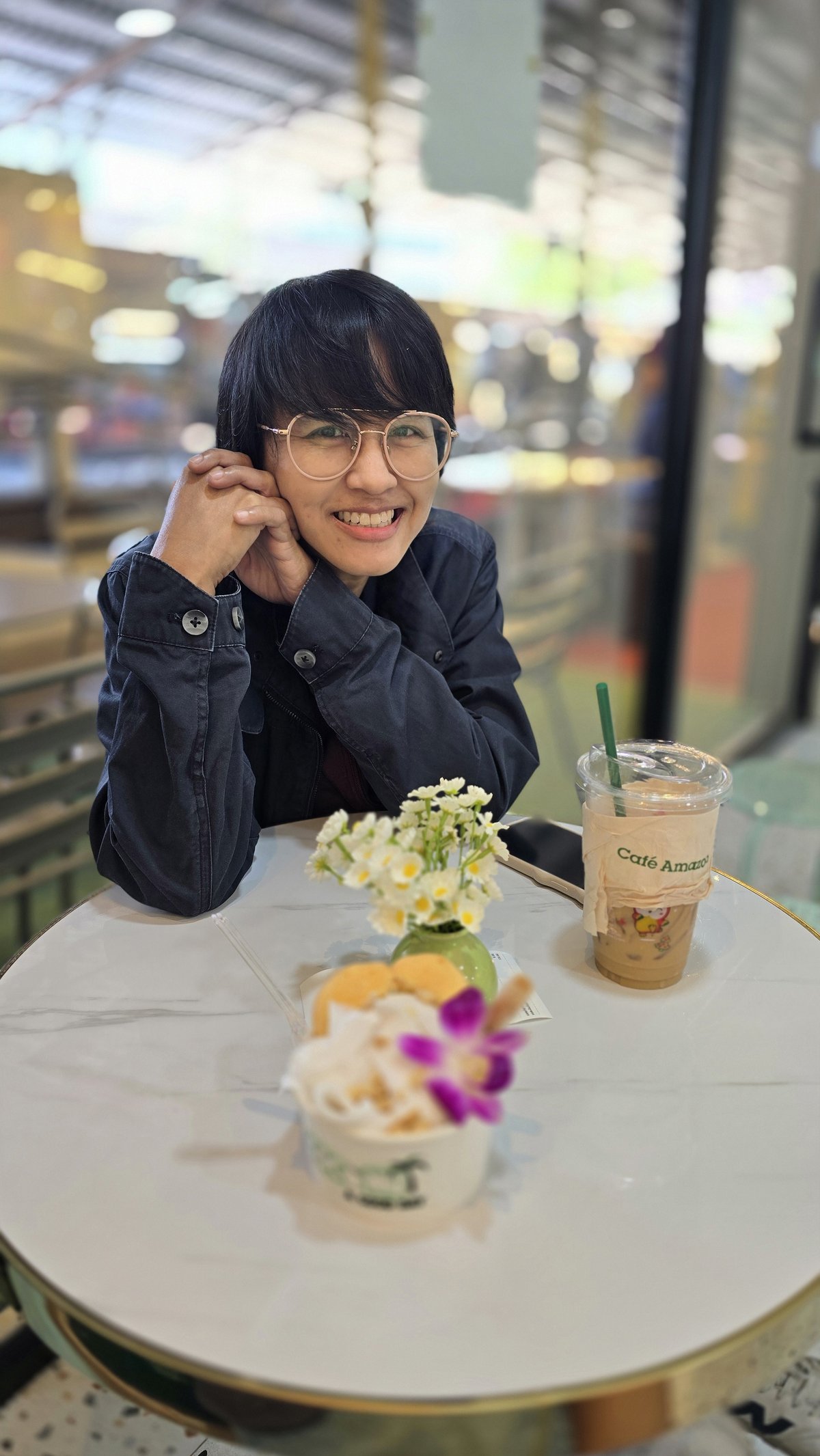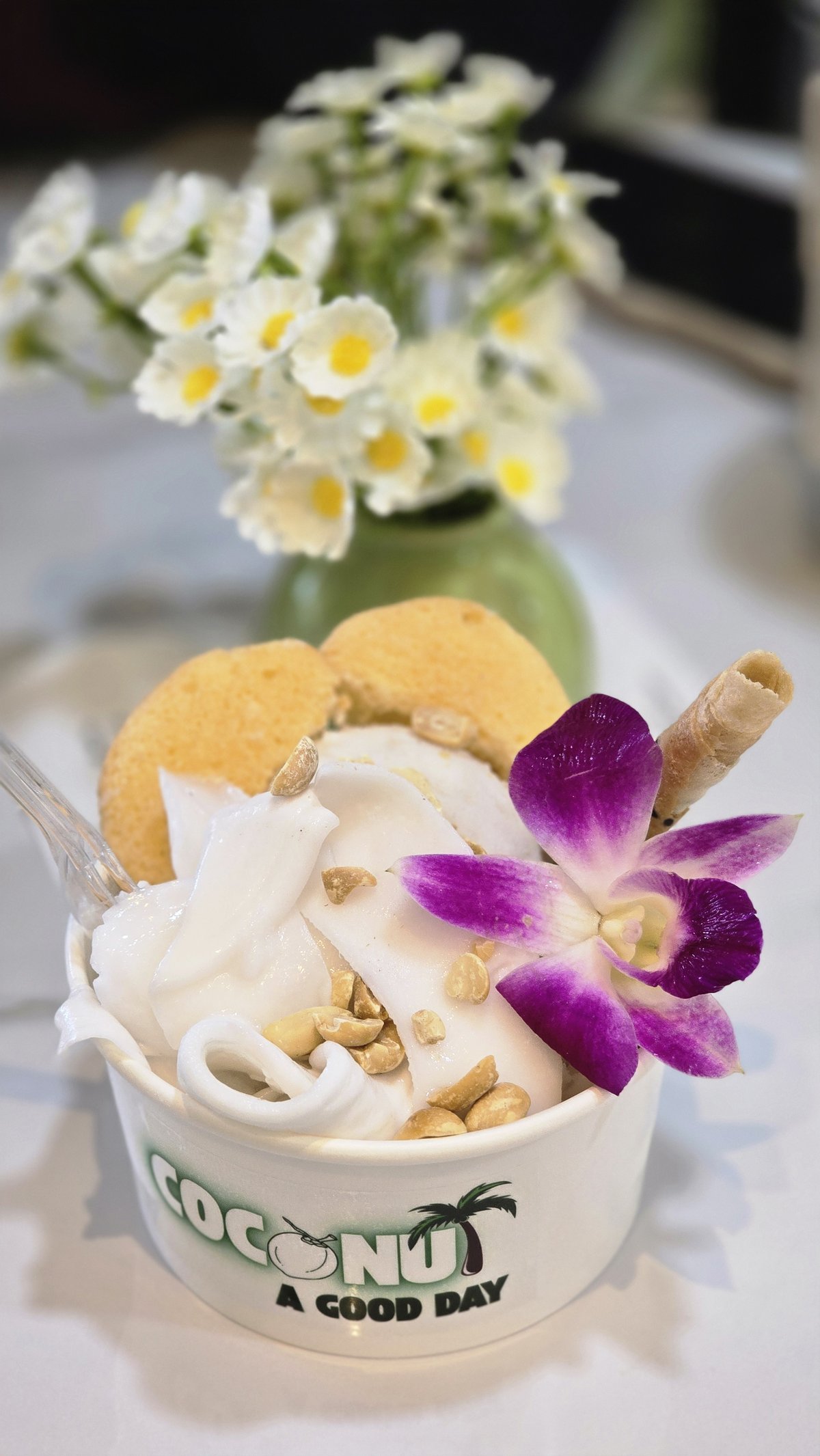 We stepped in to the coconut cafe. And I got a coconut ice-cream with local snack as toping