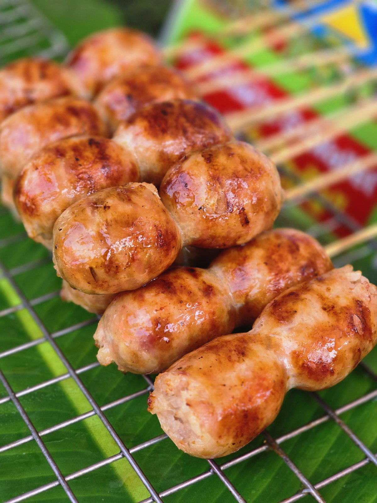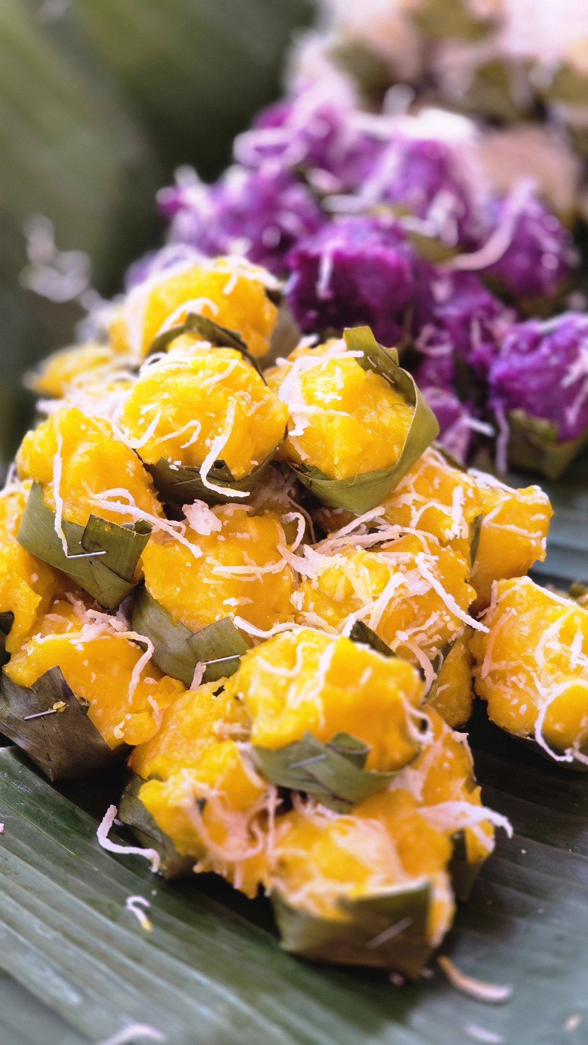 We got some Thai dessert, pumpkin, taro, banana steam and top with coconut. And also, some Thai sausage