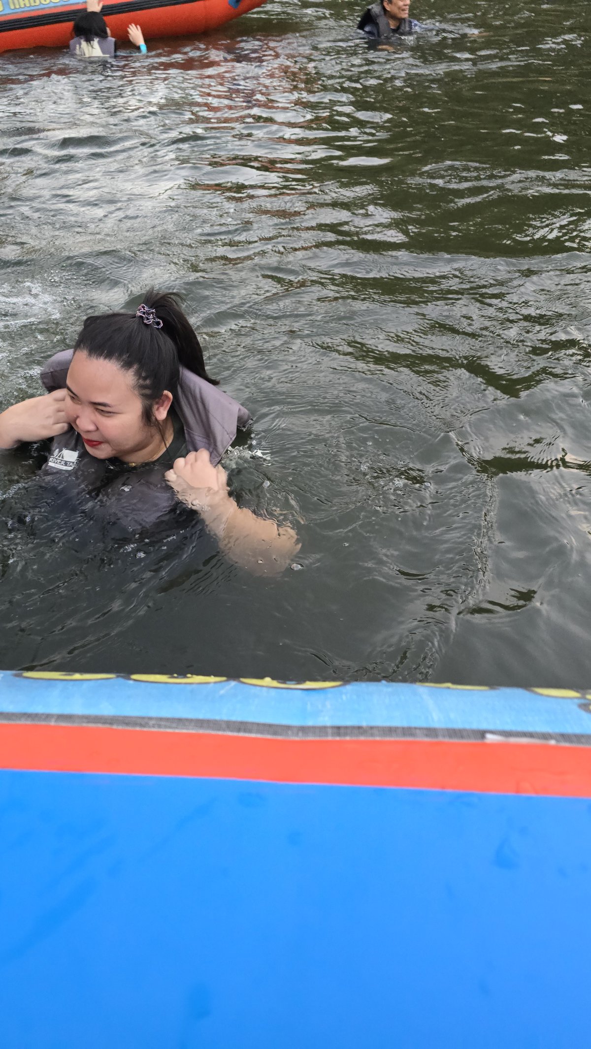 Fang finally jumps into the water. With the life jacket she just holds the rope and let herself float follow the raft